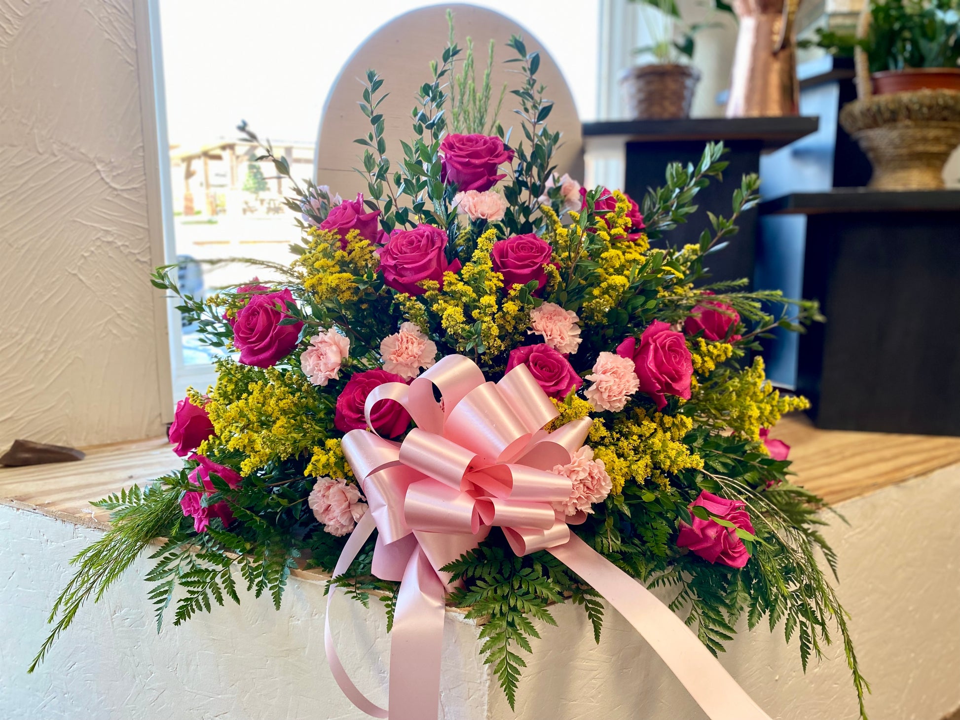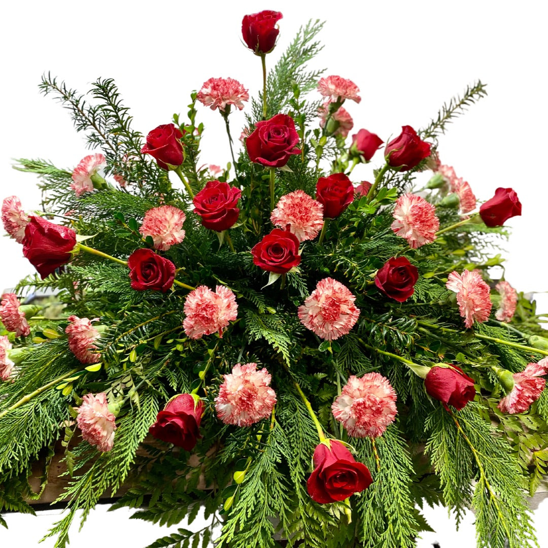 Honor a loved with a classic floral casket spray. Hand-arranged by our designers. Available for local delivery or available for pickup.