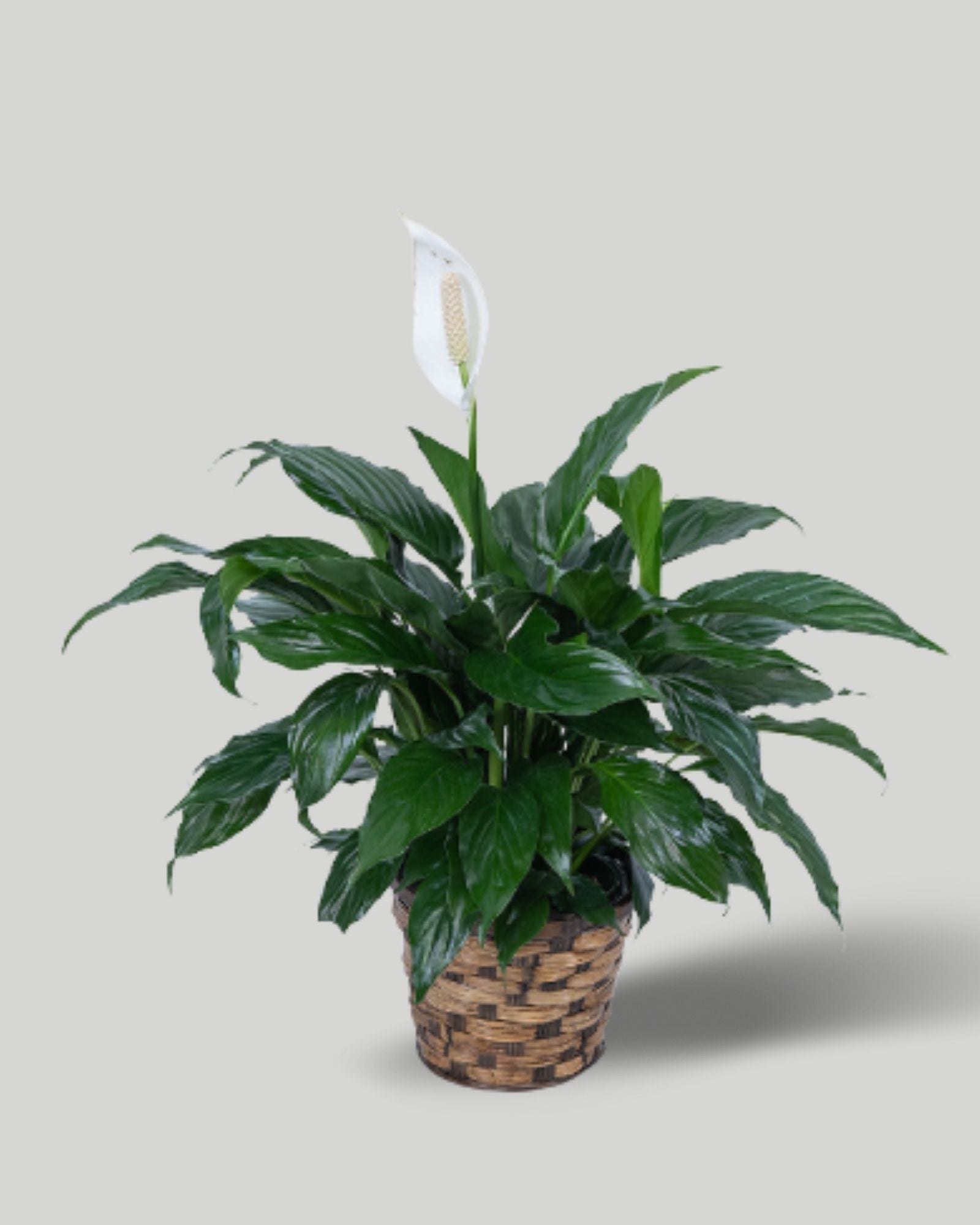 The Peace Lily (aka Spathiphyllum) has broad, dark green leaves and the occasional white calla lily flower on a tall stem.