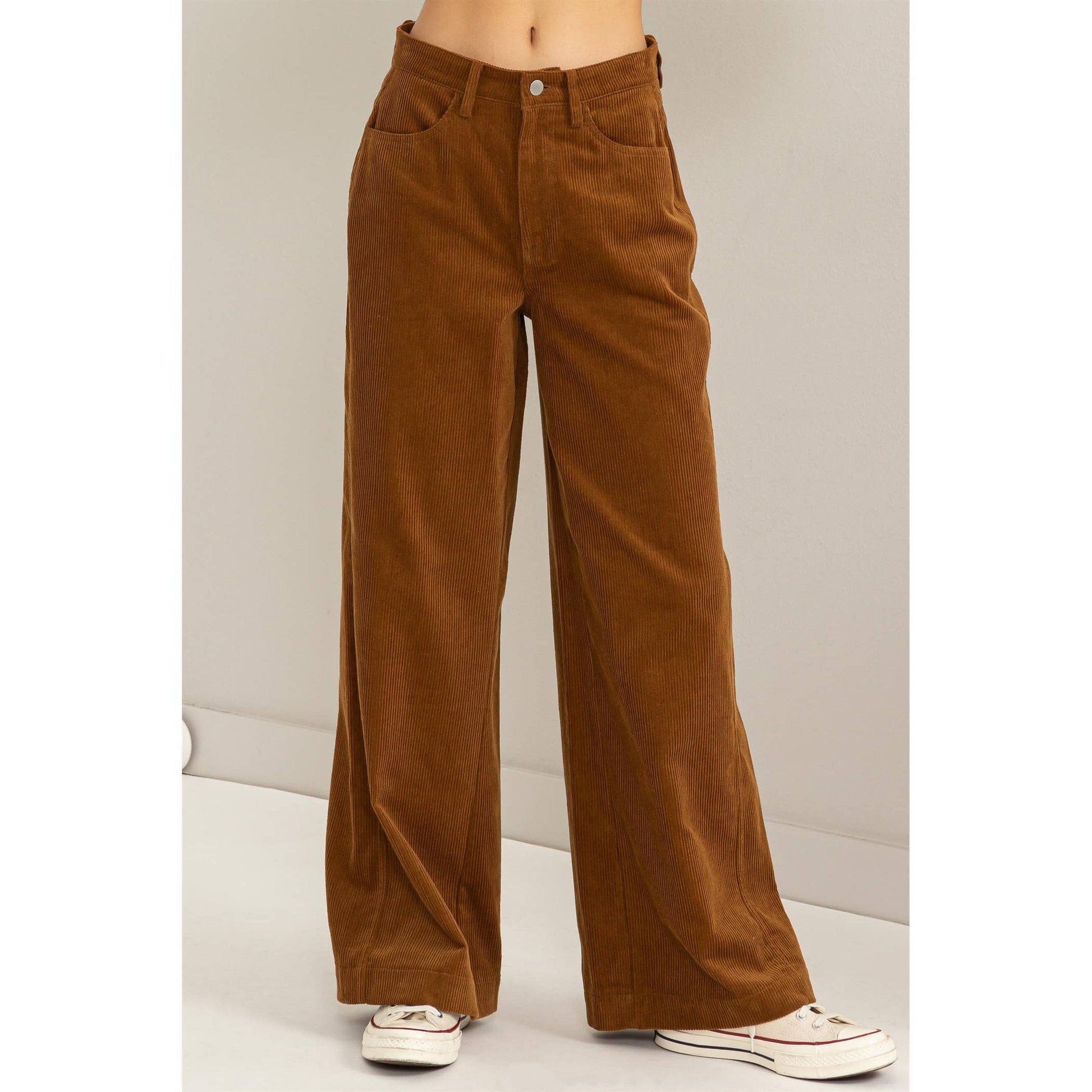 INTRODUCING THESE CHIC PANTS, A TIMELESS ADDITION TO YOUR WARDROBE! MADE FROM THE CORDUROY, THE HIGH-RISE WAIST PROVIDES A FLATTERING FIT, BEFORE DROPPING INTO A WIDE-LEG SILHOUETTE THAT ADDS A TOUCH OF ELEGANCE.