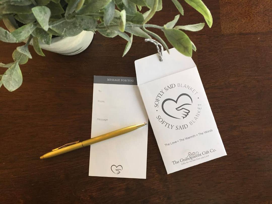 A message of appreciation is embossed on a faux leather label and sewn on the blanket for the recipient to remember your message each time it is used. The gift is packaged with a large grosgrain ribbon and gift tag. The gift tag includes a card to share a personal message.